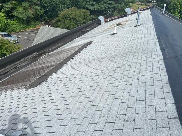 Our inspection found large areas of lose and missing shingles as well as streaking. The homeowner chose to replace the entire roof with IKO Dynasty Summit Gray Shingles.