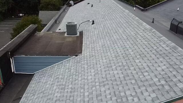 After: Project Manager Gary and crew stripped the roof, replaced damaged plywood decking, and installed new IKO Dynasty Frost Stone Grey shingles.
