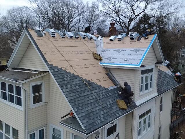 The crew kicks things off by carefully stripping all of the old shingles off of the roof. Before the teardown, large tarps are hung up around the edges of the roof to catch the falling debris. This ensures the property is fully protected as well as paving the way for a speedier cleanup process at the end.