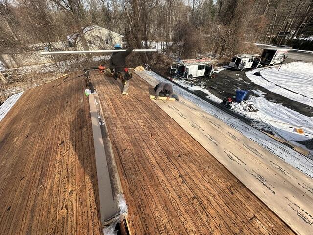 The removal of the old roof begins. As you can see, our crew has no problem starting a project in the snow!