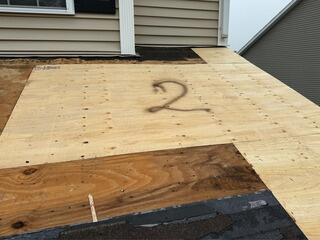 Strong new 1/2" CDX plywood replaces the removed sections. Each new sheet used is numbered so that the crew can accurately report back to the homeowner exactly how many were installed.