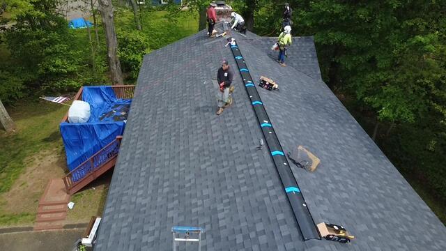 Velora One synthetic underlayment is installed over the rest of the sheathing, and after that, it's time for the brand-new shingles! These premium-laminated, architectural asphalt shingles are proudly backed by Brown Roofing's 50-year warranty. Patrick selected the great shade of Granite Black for his new roof.