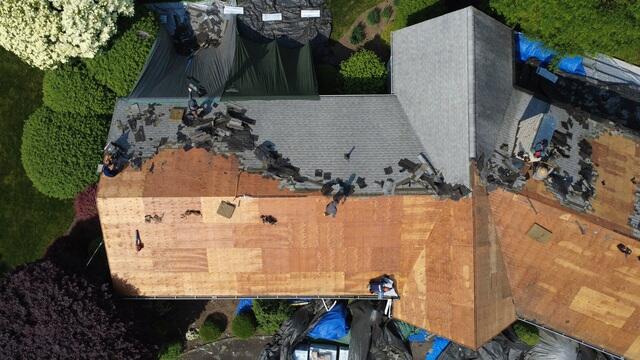 The crew kicks things off by carefully stripping all of the old shingles off of the roof. Large tarps are hung up around the edges of the roof to catch the falling debris, as well as ensure the homeowner's property is fully protected.